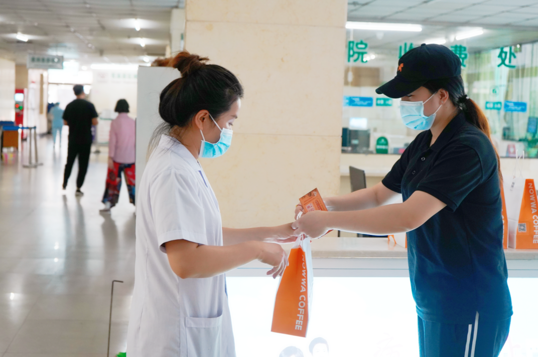 “他们时常两点一线,想喝杯咖啡都无法去买,我们就送到他们手里吧,疫情期间,工作人员确实辛苦,本就高温的天气还穿那么热......”